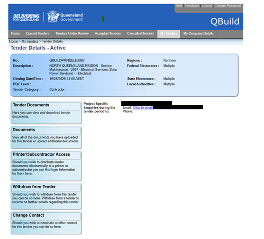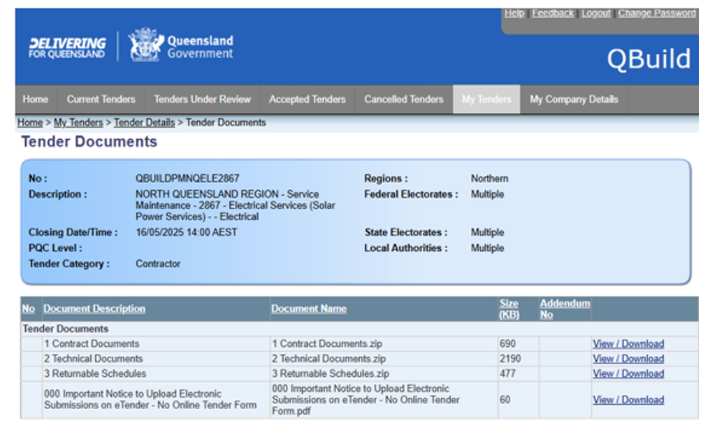 Log in to eTender and select the tender from the My tenders Listing page to display the Tender Details page for the tender.